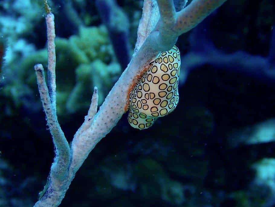 The body of these snails secretes digestive juices to digest the tissues. They are found mostly in the Caribbean Sea. This aquatic animal has yellow spots over its body which depicts the living tissues that disappear as soon as the animal dies.