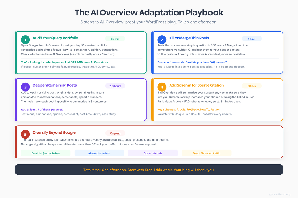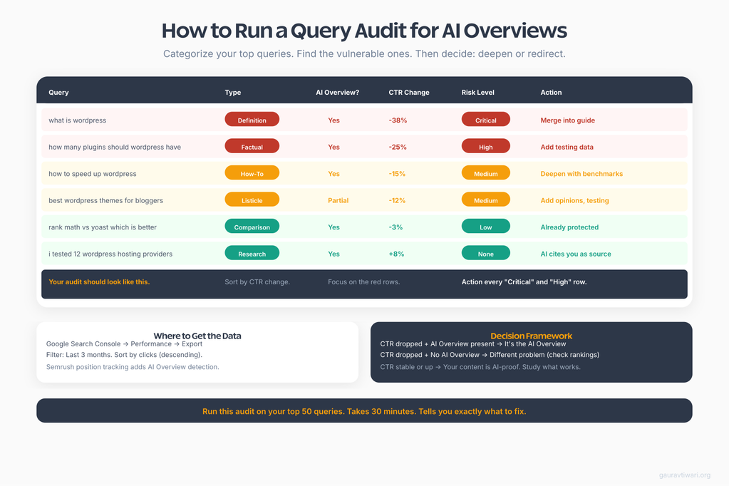 1. Audit your query portfolio. We covered this above. Categorize your queries by intent type and AI Overview exposure. Know exactly which content is at risk.