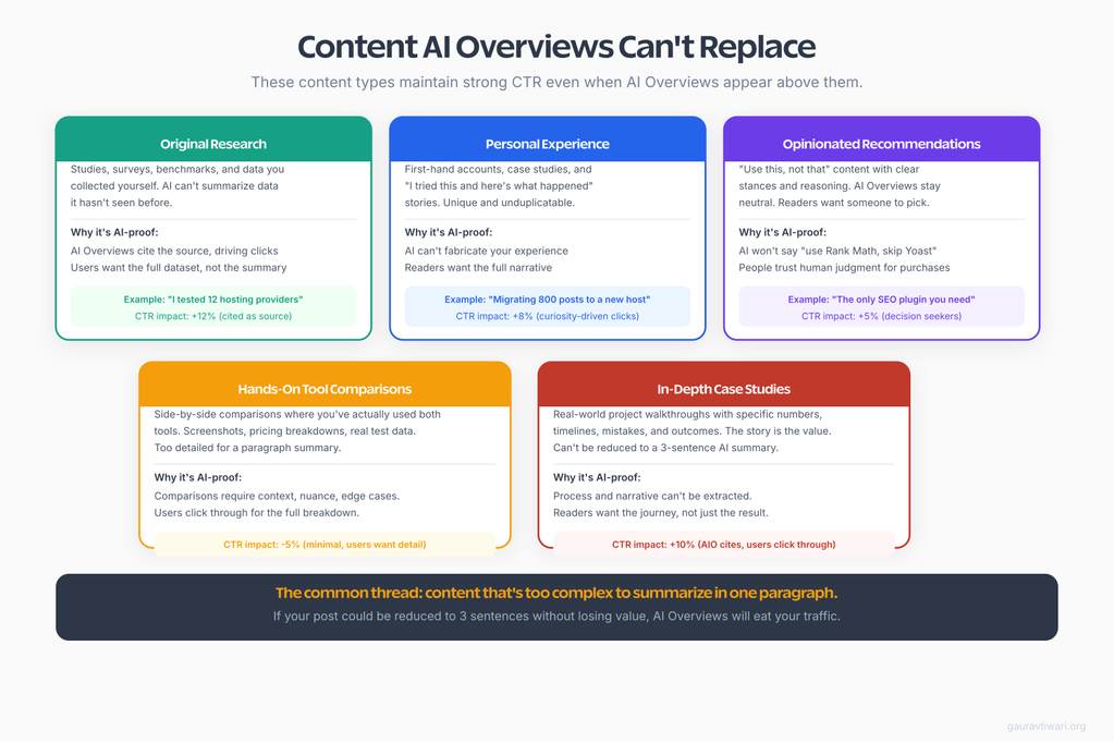 Some content types are nearly immune to AI Overview cannibalization. I’ve studied this across my own sites and dozens of others, and the pattern is consistent.