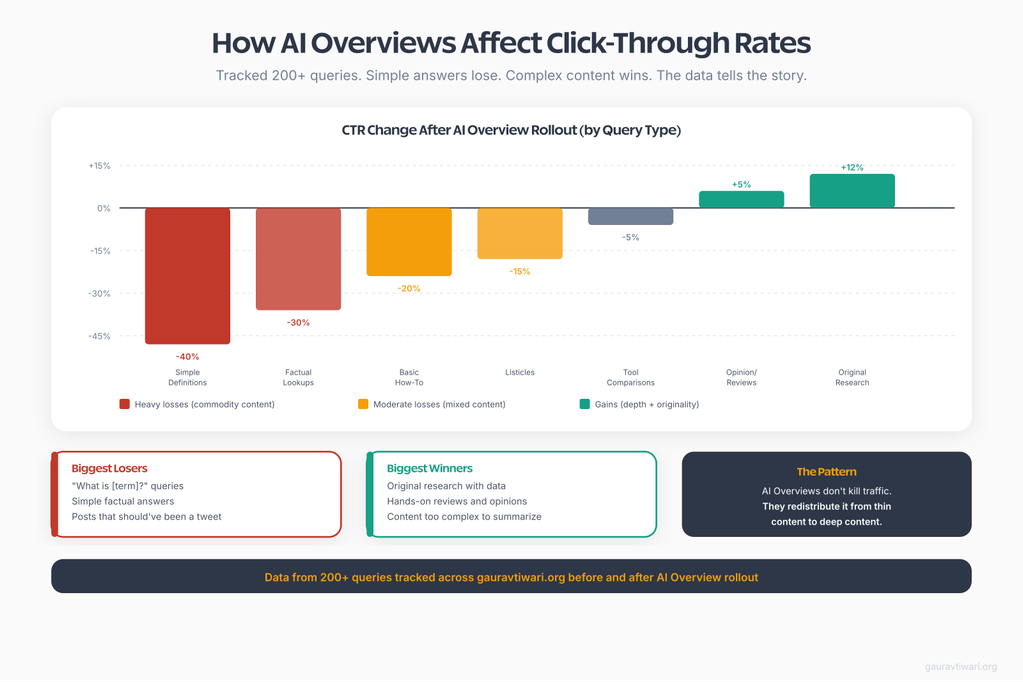 I did this audit last quarter. Out of 50 queries I checked, 18 triggered AI Overviews. My CTR dropped on 14 of those 18. But the other 32 queries were unaffected. The traffic “decline” I initially blamed on AI Overviews was actually concentrated in a narrow slice of my content… the simple factual stuff I probably shouldn’t have been relying on anyway.