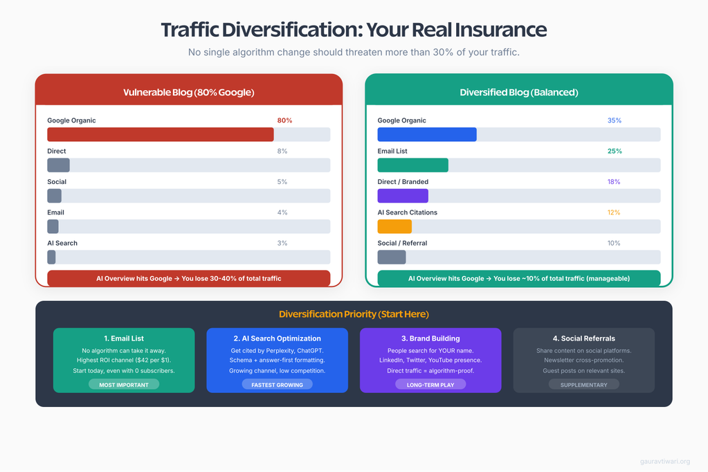 5. Diversify traffic sources beyond Google. This is the real insurance policy, and it leads to the next section.