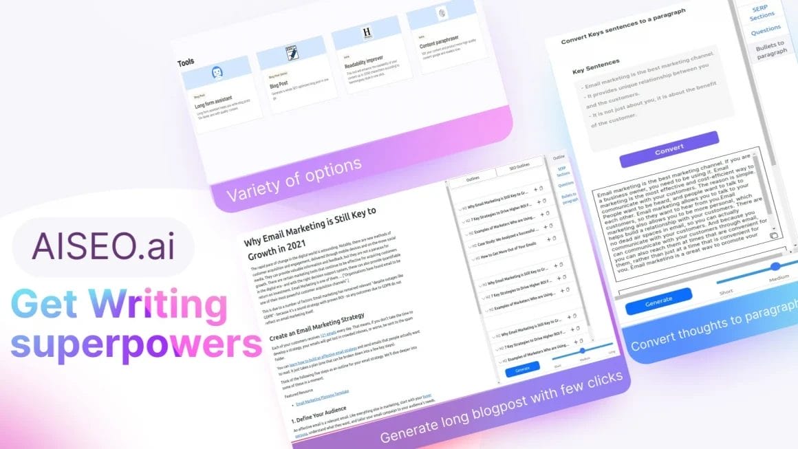 AISEO.ai is a powerful writing assistant that can create, optimize, and rewrite content or blog posts for you with great speed and almost ten times more efficiency. It allows you to generate an SEO-optimized blog post with just a few clicks of your mouse.