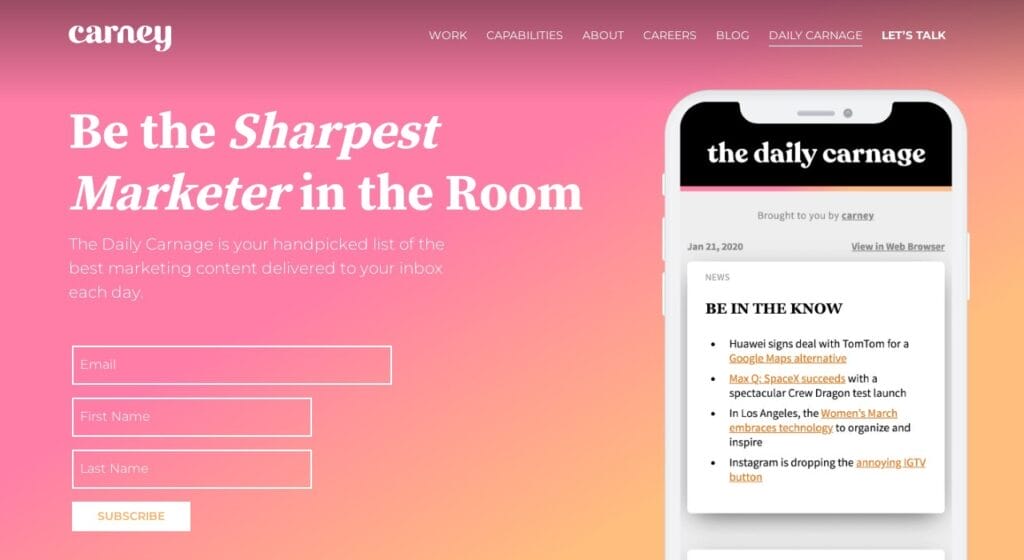 The Daily Carnage is a lively copywriting blog and newsletter that delivers a daily dose of marketing inspiration. By gathering the best writing and marketing resources from across the web, it offers fresh ideas and innovative tools right to your inbox. Although its content is more of an appetizer than an in-depth analysis, it’s a great way to stay updated on the latest trends in copywriting and digital marketing.