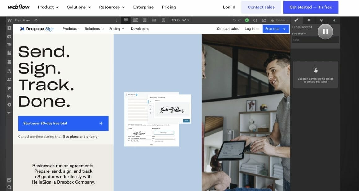 | Webflow | Responsive designs, animations, interactions, visual editor, pre-built templates | Free to start |