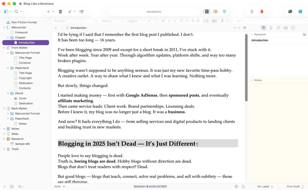 - Books: Scrivener. No serious alternative for long-form organization. The learning curve is worth it if you’re writing anything book-length.