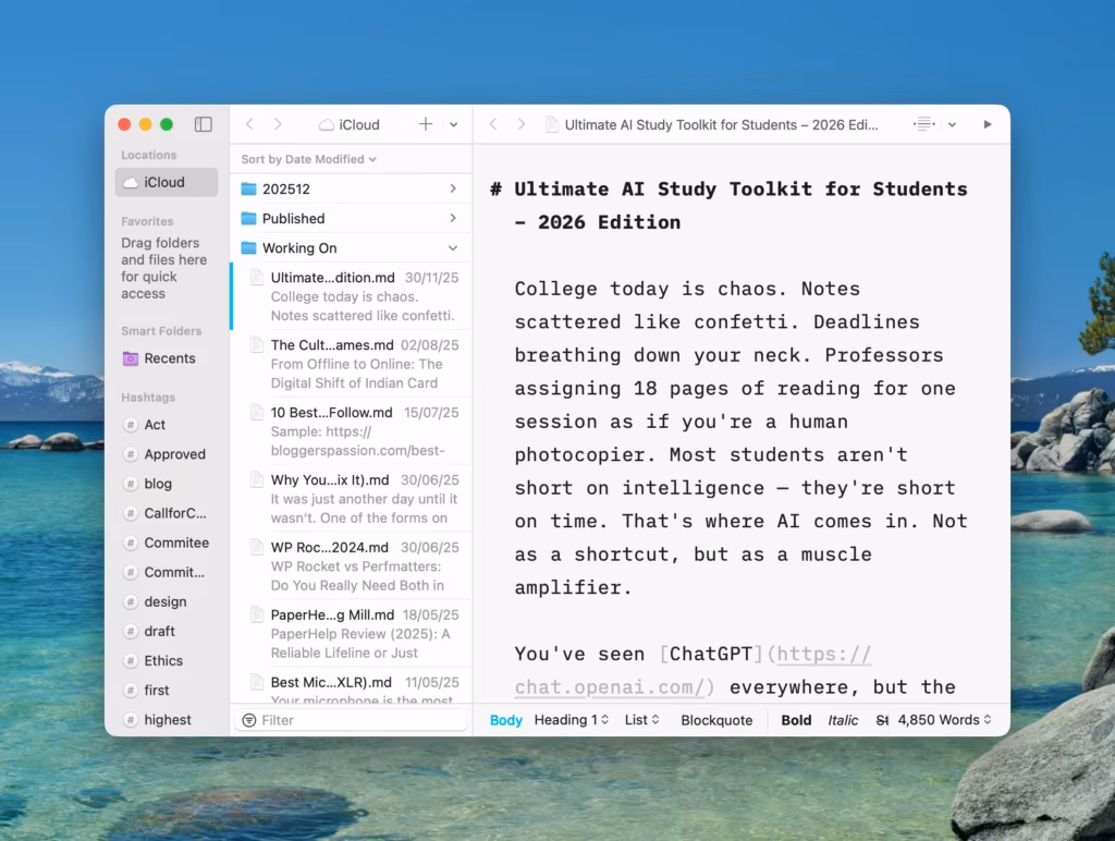 Typora is my daily driver for final article writing. It’s a minimal markdown editor with live preview. Markdown is a plain text format that uses simple symbols for formatting, like **bold** for bold and # for headings. No split pane showing raw markdown on one side and rendered text on the other. You write, and the formatting happens as you type.