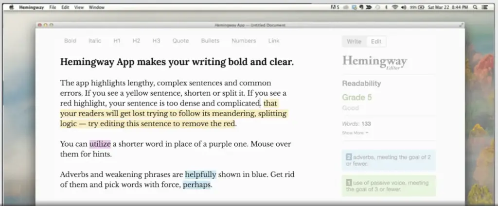 Web-based with a Mac app available. Paste finished drafts into Hemingway for a readability check before publishing. It’s particularly good at finding sentences that made sense when they were written but don’t make sense to anyone else. Named after Ernest Hemingway, whose spare prose style the app encourages.