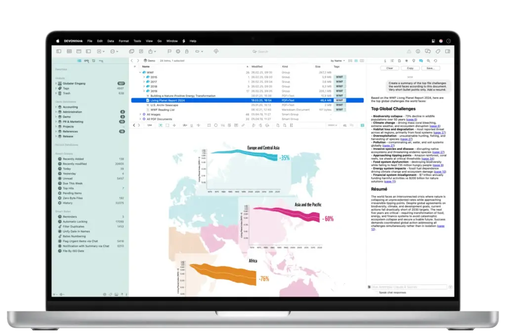 DEVONthink is a research organization powerhouse. AI-powered classification learns how you categorize things over time, suggesting where new documents belong based on your existing organization. PDF annotation is built in. Search finds anything instantly across thousands of documents using fuzzy matching and boolean operators.