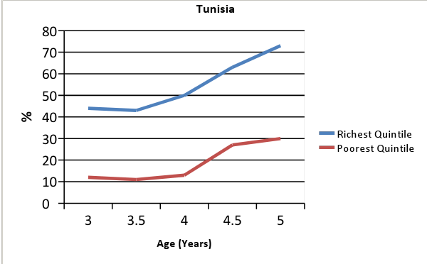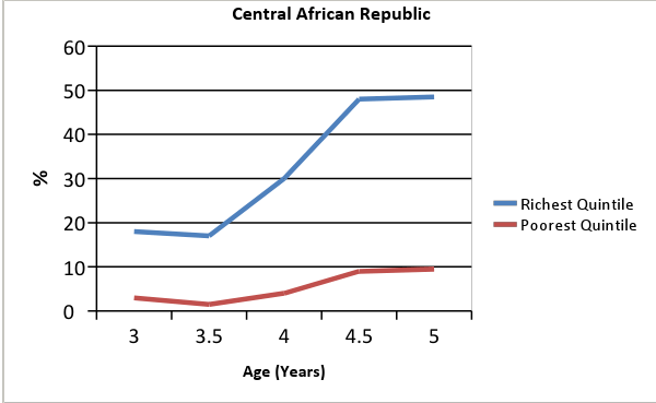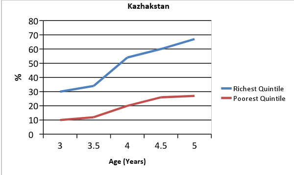Percentages of children between the ages 3-5, who can recognize 10 letters of the alphabet, by wealth quintile, of selected countries: