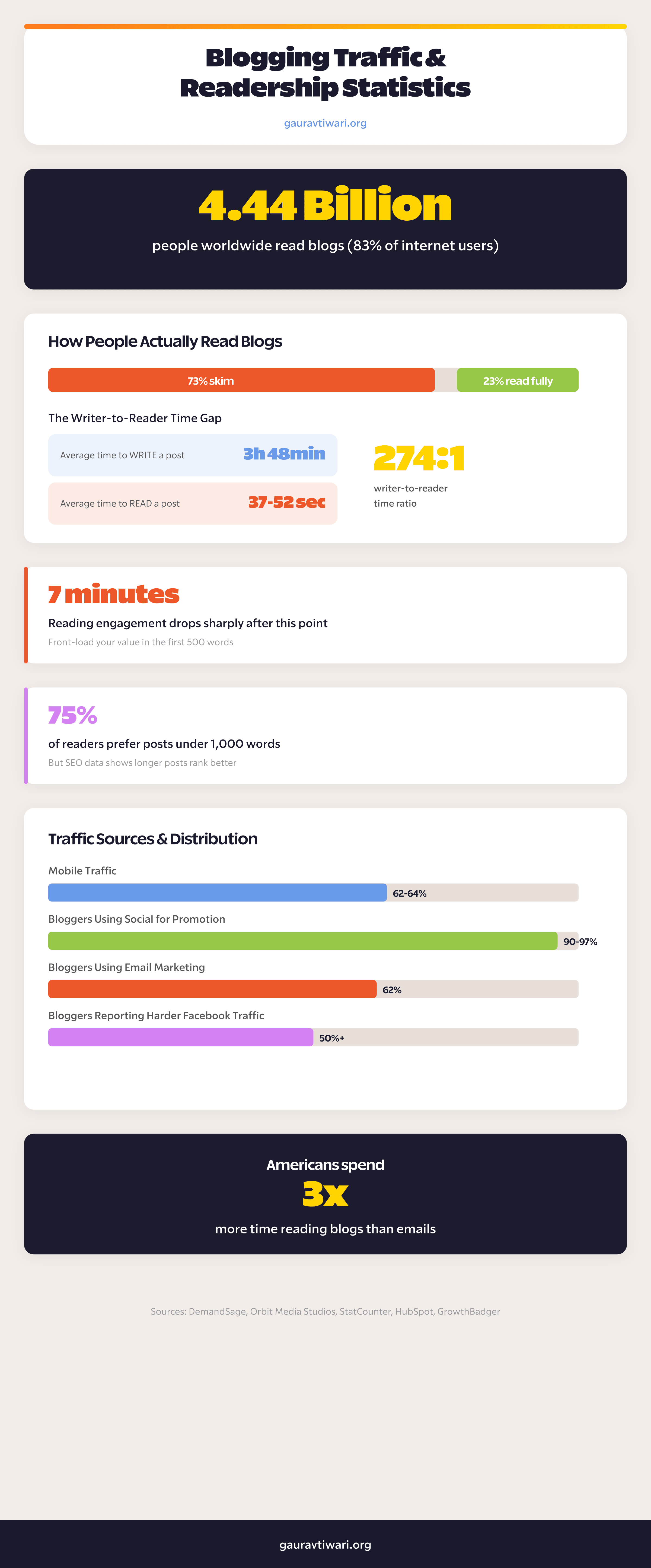 73% of readers skim blog posts rather than reading them fully. Only 23% read the whole thing (DemandSage). The average reader spends 37 to 52 seconds on a blog post (DemandSage).