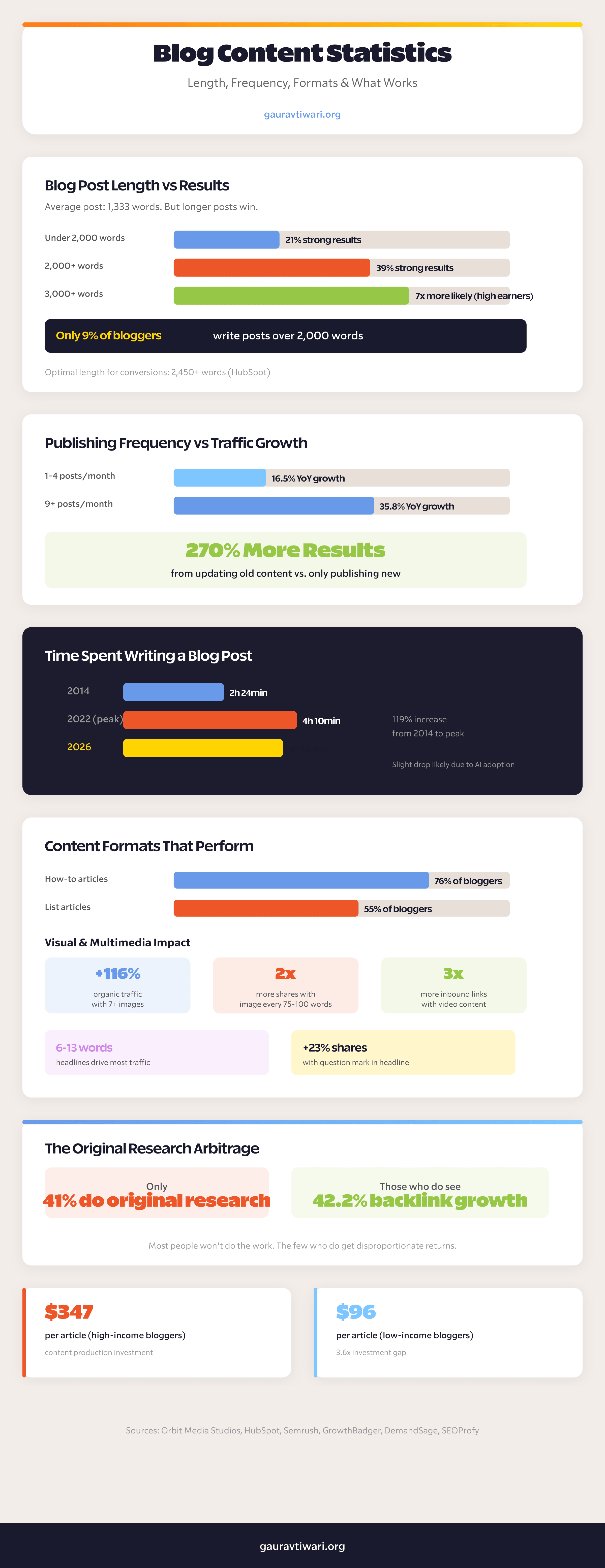 I pulled together 78 stats from Orbit Media Studios, HubSpot, Ahrefs, RankIQ, W3Techs, and GrowthBadger to give you the full picture. Not just the cheerful stuff. The uncomfortable numbers too. Because if you’re going to invest 3 hours and 48 minutes per blog post (the 2026 average), you should know exactly what the odds look like.
