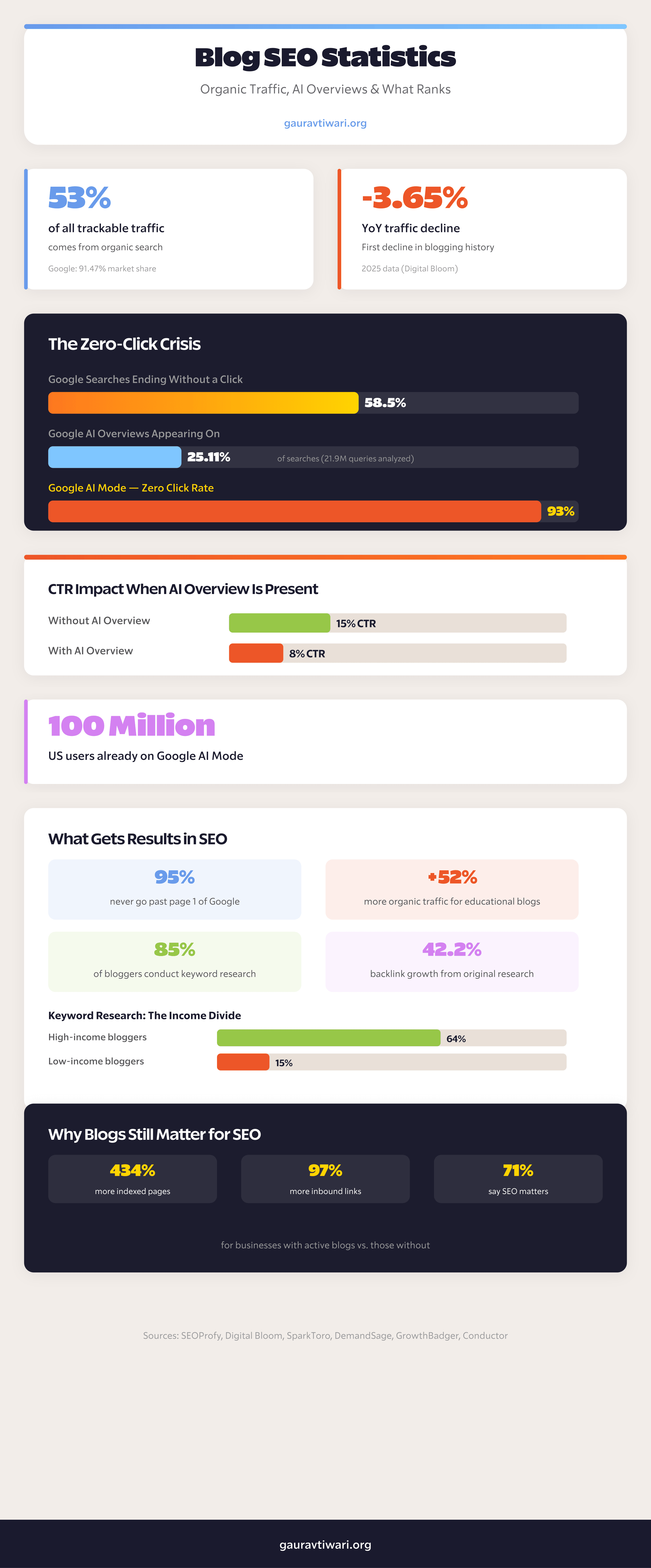 But organic traffic declined 3.65% year-over-year in 2025 (Digital Bloom). For the entire history of blogging, organic traffic grew every year. Until now.