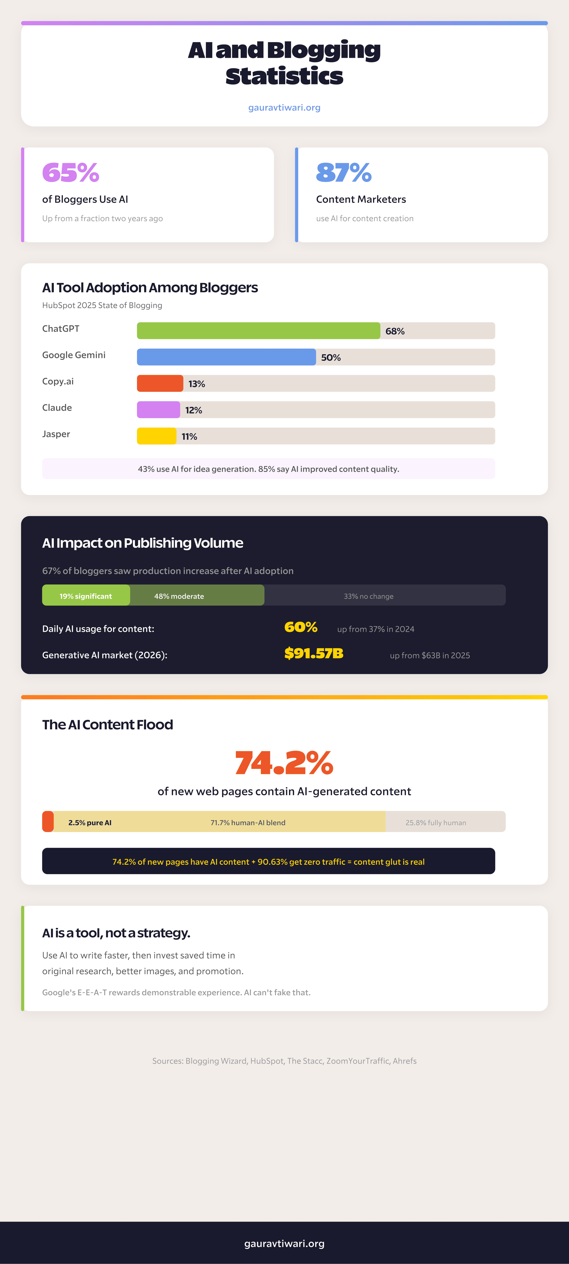 65% of bloggers and 87% of content marketers now use AI tools. ChatGPT leads at 68% adoption, followed by Google Gemini at 50% and Claude at 12%. But 74.2% of new web pages contain AI content, and 90.63% get zero traffic. The content flood is real.