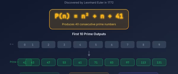 Euler discovered a simple formula that generates 40 consecutive prime numbers: n squared plus n plus 41. Plug in 0…
