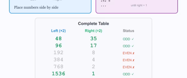 Russian Peasant Multiplication is an ancient technique that multiplies any two numbers using only doubling and halving. No multiplication tables…