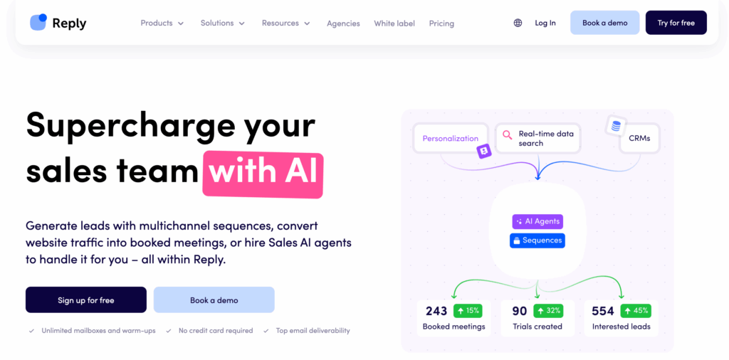 - Deliverability features. Email warmup, domain rotation, and sending limits that protect your sender reputation. Without these, nothing else matters.
