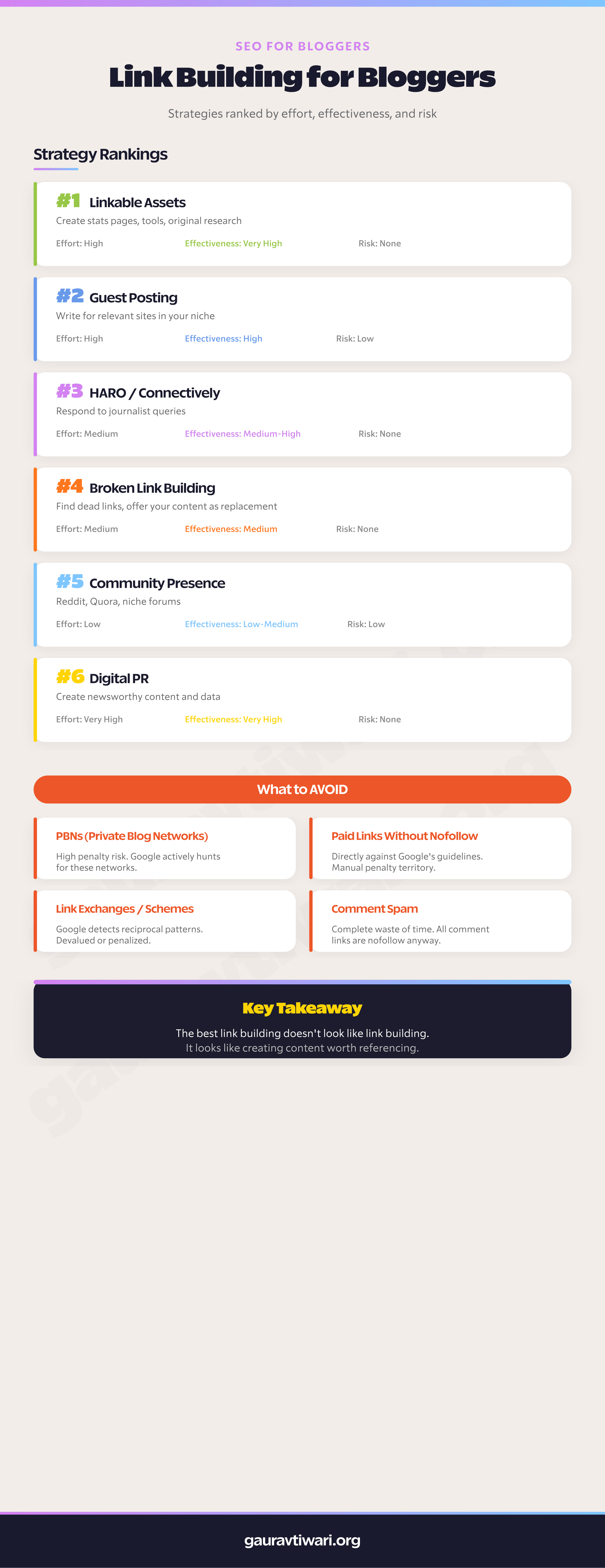 The key word there is “quality.” Ten links from random directories won’t do what one link from a respected industry blog will do. I’ve spent years figuring out what actually works for bloggers specifically. Not for agencies with outreach teams and budgets. For individual bloggers who need a realistic, sustainable approach.