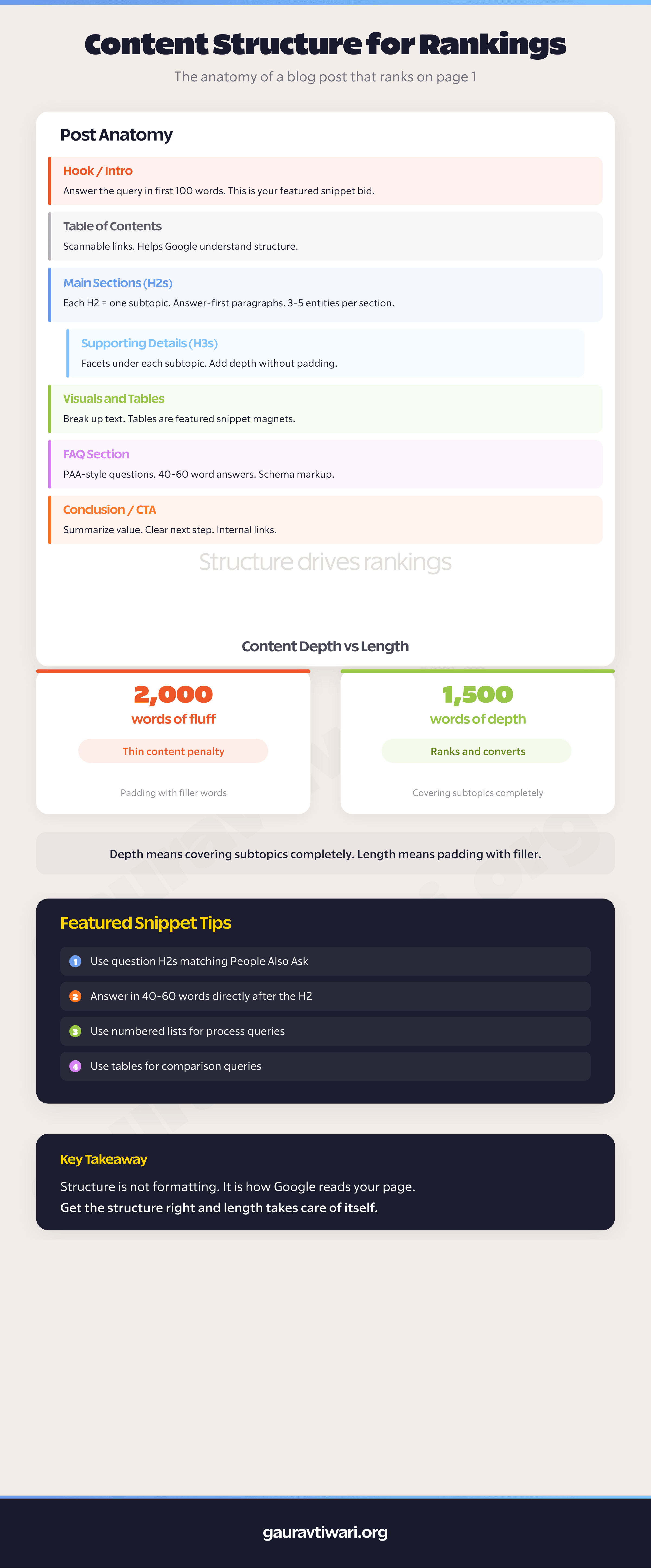 Most bloggers think “write more words” is the SEO strategy. I used to think this too. Back in 2012, I’d crank out 3,000-word posts stuffed with every related keyword I could find, and some of them actually ranked. But Google got smarter. And the posts that rank now? They’re not the longest ones. They’re the ones with the clearest structure.
