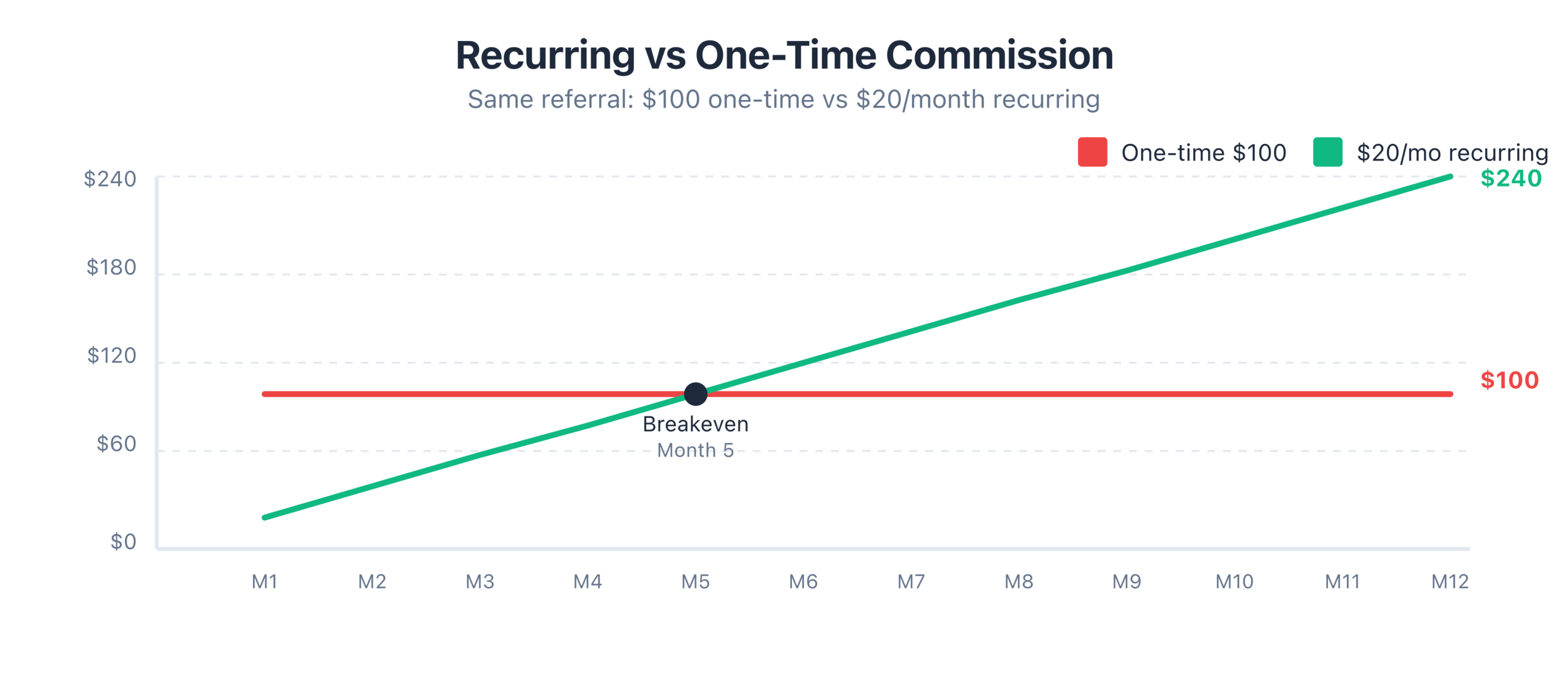 Compare that to 10 one-time referrals per month at $65 each: $650/month. Every month. No growth. To earn $2,822/month with one-time commissions, you’d need to generate 43 referrals per month, over four times the volume.