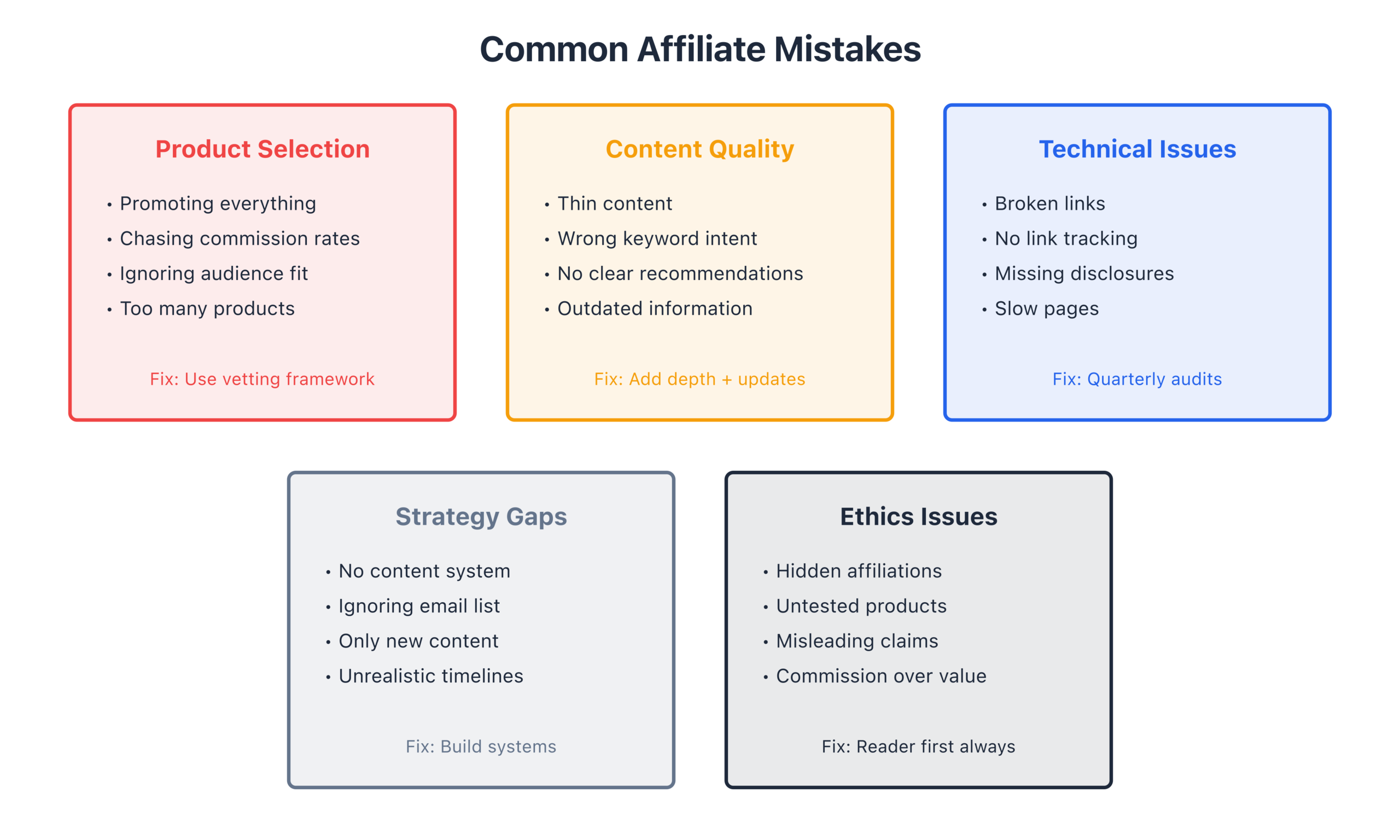 This chapter isn’t about theory. It’s a field guide to the mistakes I’ve seen over 16+ years of building affiliate sites and consulting for hundreds of bloggers. I’ve organized them into four categories: Foundation, Content, SEO, and Ethics. Each one comes with the fix that actually works.