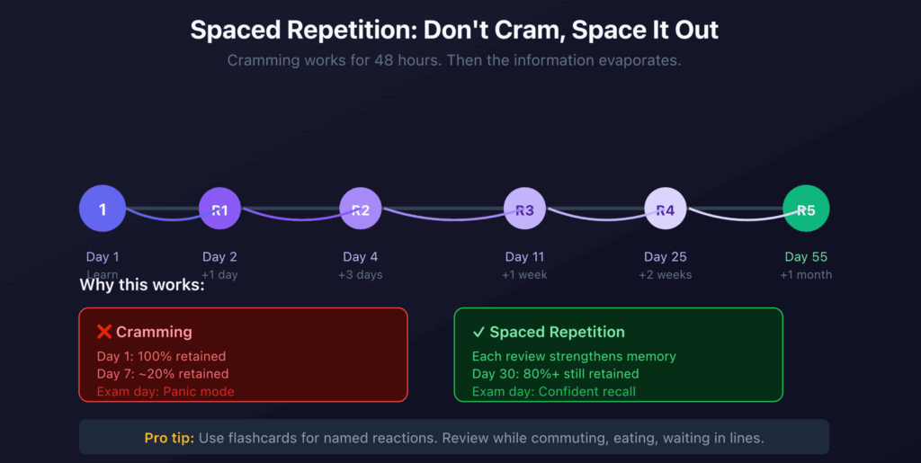 If you’re studying Inorganic Chemistry in September and your exam is in March, you will forget everything unless you review periodically. Space your reviews: after 1 day, after 3 days, after 1 week, after 2 weeks, after 1 month.