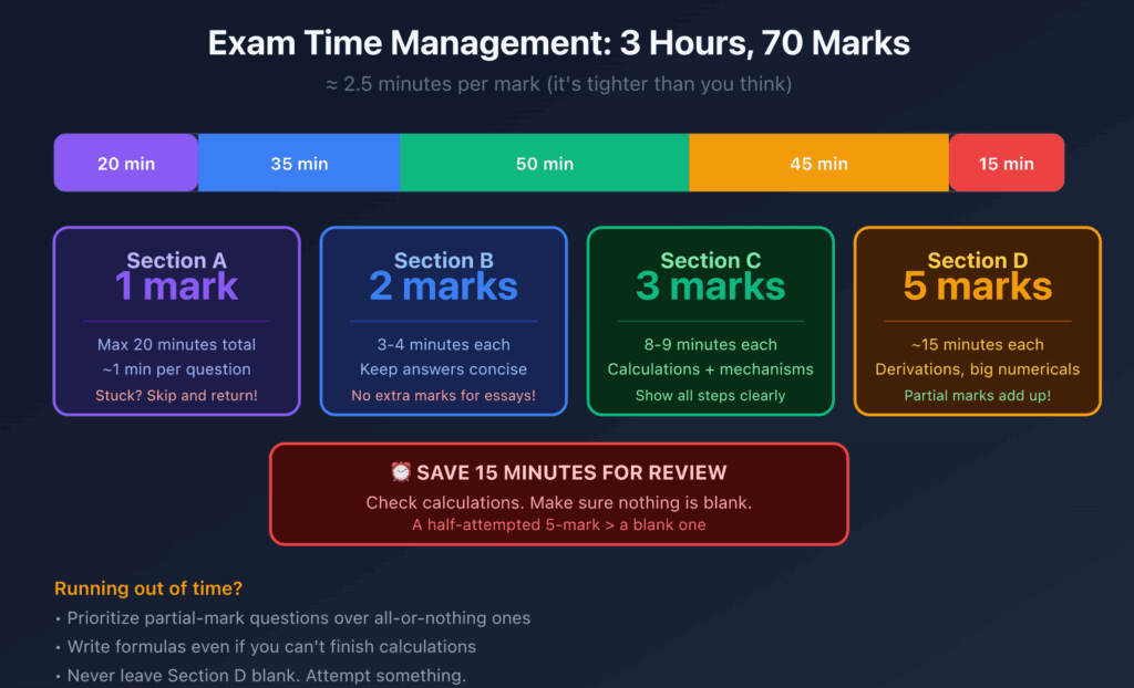 - Section D (5-mark questions): About 15 minutes each. These are usually derivations, comprehensive numerical, or comparison tables. Attempt these even if you’re not fully confident. Partial marks add up.