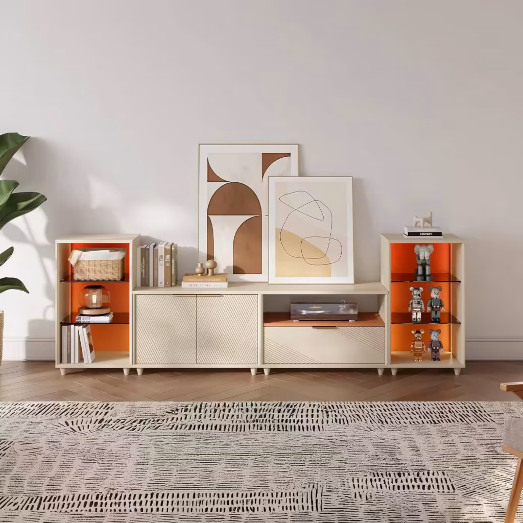 The Solmere TV Stand is a modular superstar designed for flexibility and flair. Its structure invites customization — combine cabinet modules and drawer units to suit your space perfectly. Adjustable shelves keep consoles, books, and media neatly organized, while built-in LED lights (controllable via remote or app) add a cinematic touch to your binge-watch sessions. It even includes a built-in power outlet, so you can plug in devices without the usual tangle of cables — a true gem in this year’s Furniture Black Friday lineup.