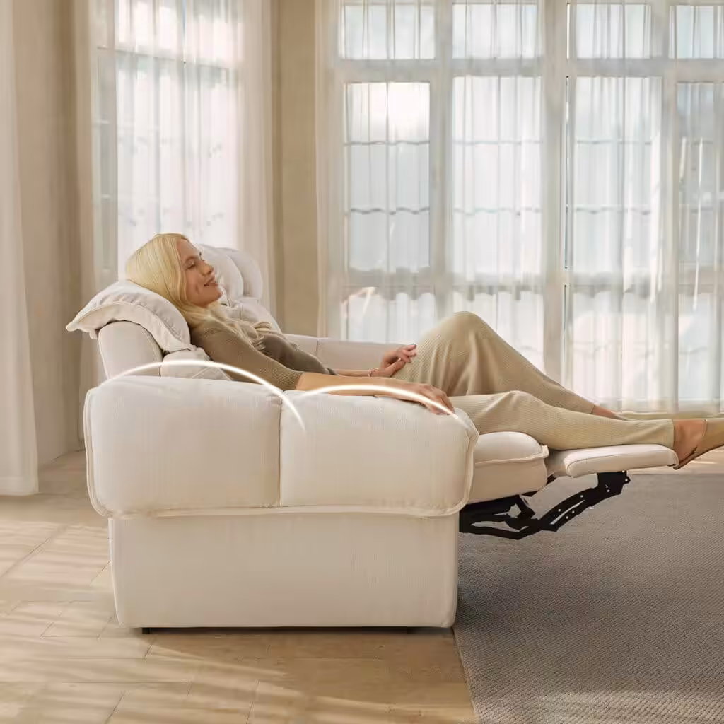 The AeroStretch takes recliners to new heights. Its zero-wall design means you can push it close to the wall without losing the ability to recline—perfect for smaller living rooms. The smooth reclining mechanism adjusts seamlessly, letting you find the perfect angle. Inside, tailored lumbar zones support your back, making long movie marathons a pleasure instead of a pain. A drop-down table tray with cup holders and charging ports turns your sofa into a mini workstation or dining area—a true gem in this year’s Furniture Black Friday lineup.