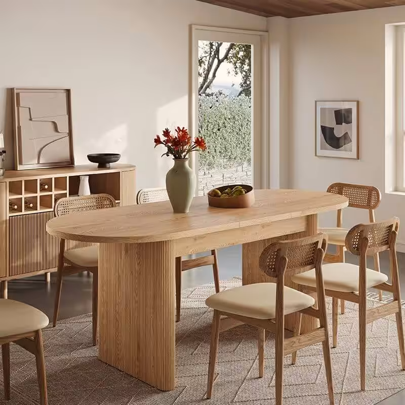 | Todd Japandi Extendable Oval Wood Dining Table | $599 ($899) | $300 off | Japandi design, expands 63–79″, scratch-resistant, one-person mechanism |