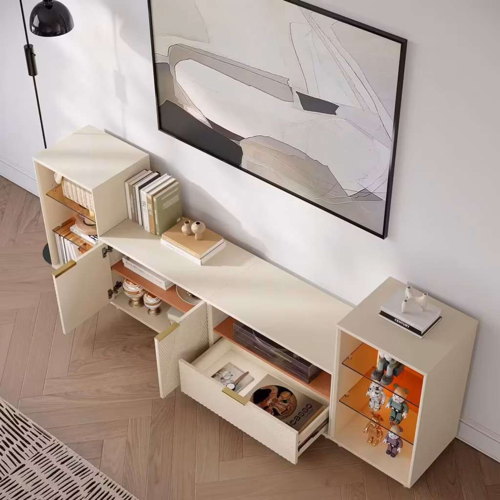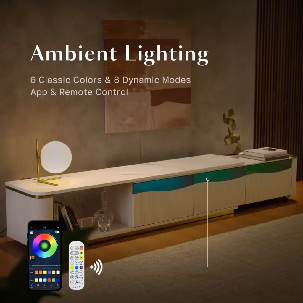 Design Perks: The fluted panels and vibrant color options bring texture and life to your living room. This isn’t another dull black box — it’s a statement piece that draws attention. Plus, with its extendable design (60″ to 124″), it fits effortlessly in both cozy apartments and expansive entertainment setups.