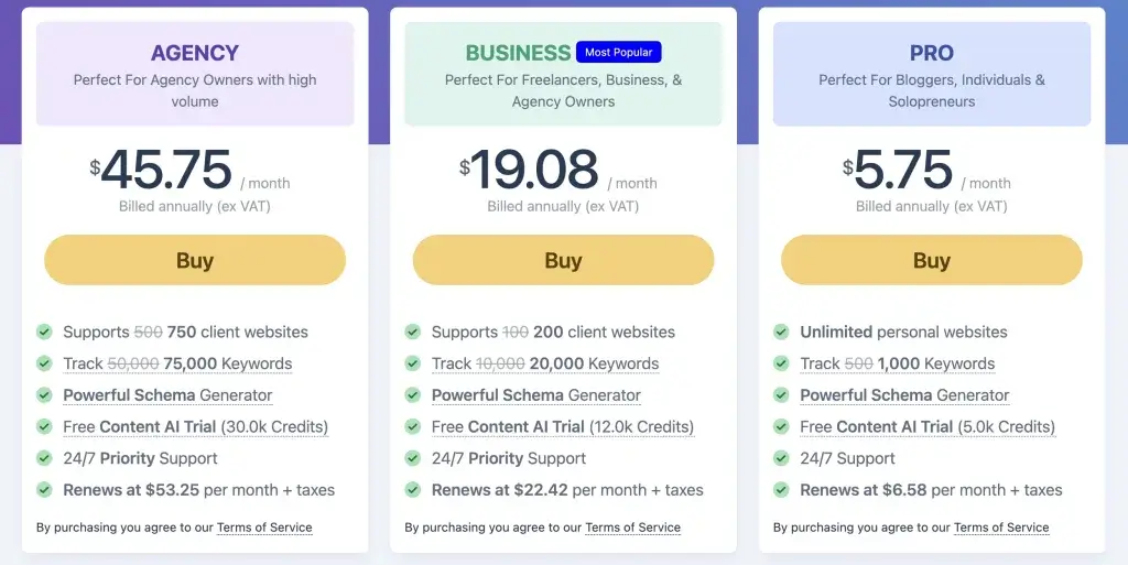 Rank Math has three pricing plans: