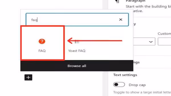 Step 3 – Click on the + button and type FAQ in the search. Then click on the Yoast FAQ. (See Below).