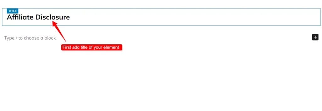 To make an affiliate disclosure with Kadence hooks you first have to add the title of the element which in my case is “Affiliate disclosure”.