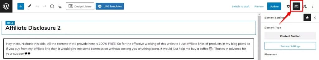 After doing that you can use Kadence blocks or any other page builder to design the affiliate disclosure that you want to show on your website.