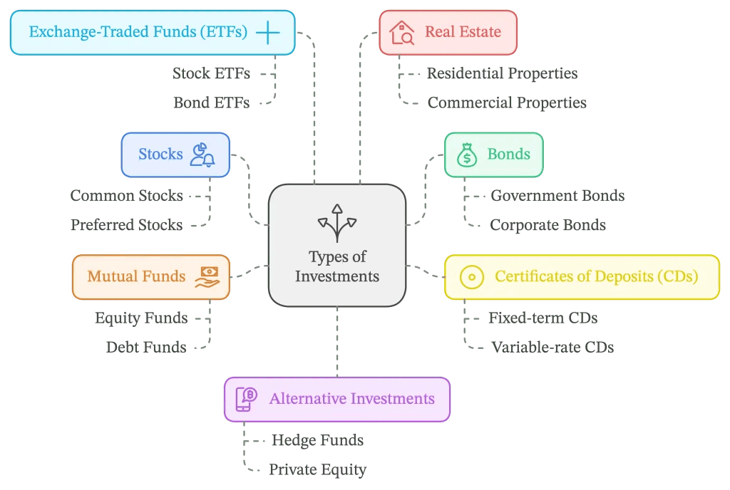 Now that you’re familiar with the key concepts of investing, let’s learn more about the different types of investments available. Each of them has its own unique characteristics, benefits, and risks. Understanding them is crucial for building a diversified investment portfolio.