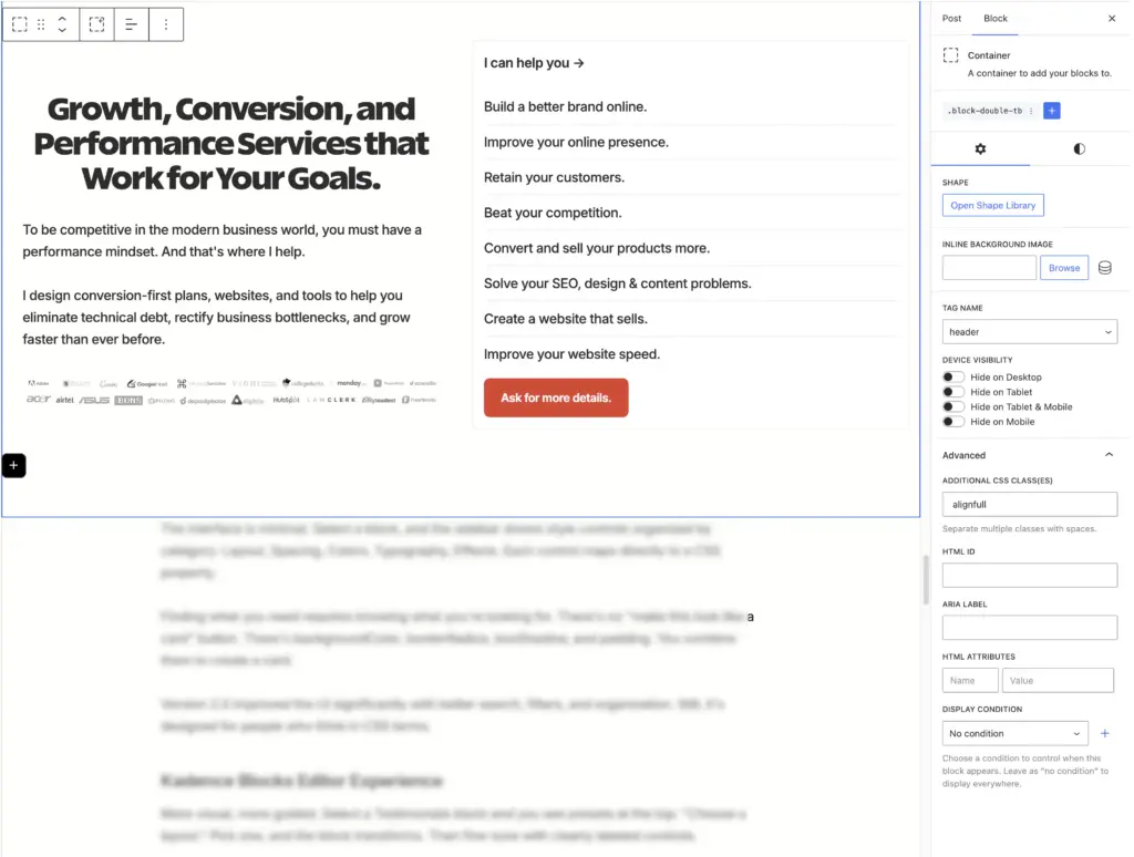 Container Block: The foundation of everything. It’s a wrapper that can be a div, section, article, header, footer, or any semantic HTML element. You control display properties, flexbox layouts, spacing, backgrounds, and more. One block that does the job of ten specialized blocks in other plugins.