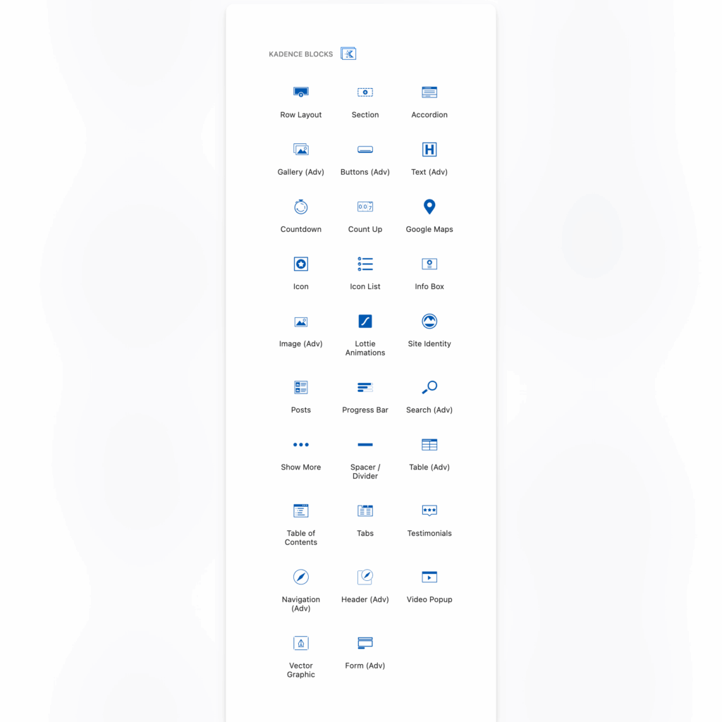 - Kadence Blocks follows an abundance philosophy. It gives you 30+ blocks covering specific use cases: Row Layout, Advanced Gallery, Testimonials, Accordion, Tabs, Progress Bar, Info Box, Icon List, Form, Table of Contents, Countdown, and many more. Each block includes multiple pre-built layouts you can insert and customize immediately.