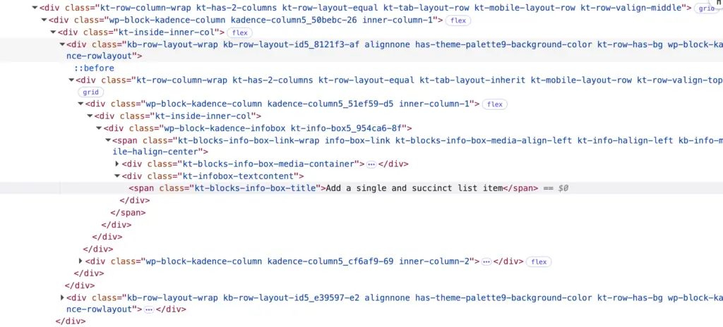 Kadence produces more markup than GenerateBlocks. More wrapper divs, more classes, more CSS. It’s not bad by page builder standards, far cleaner than Elementor or Divi. But it’s noticeably heavier than GenerateBlocks.