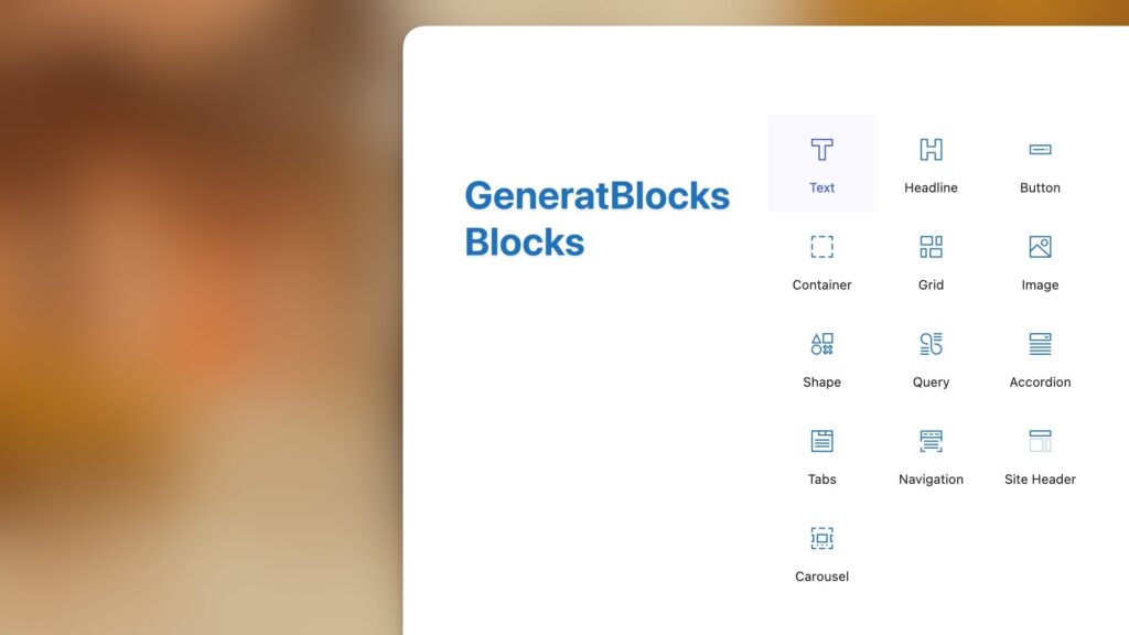 - GenerateBlocks follows a minimalist philosophy. It gives you 13 blocks total (8 free, 5 Pro). That’s remarkably restrained compared to competitors. The free blocks are Container, Grid, Text, Button, Headline, Image, Query, and Shape. Pro adds Site Header, Navigation, Accordion, Tabs and Carousel. The idea is that these foundational blocks can create anything. You’re not getting dozens of pre-designed components. You’re getting flexible primitives that you combine however you want.