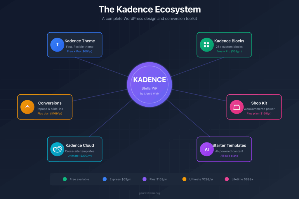 - Plus: $169/year for up to 10 sites (adds Kadence Conversions + Shop Kit)
