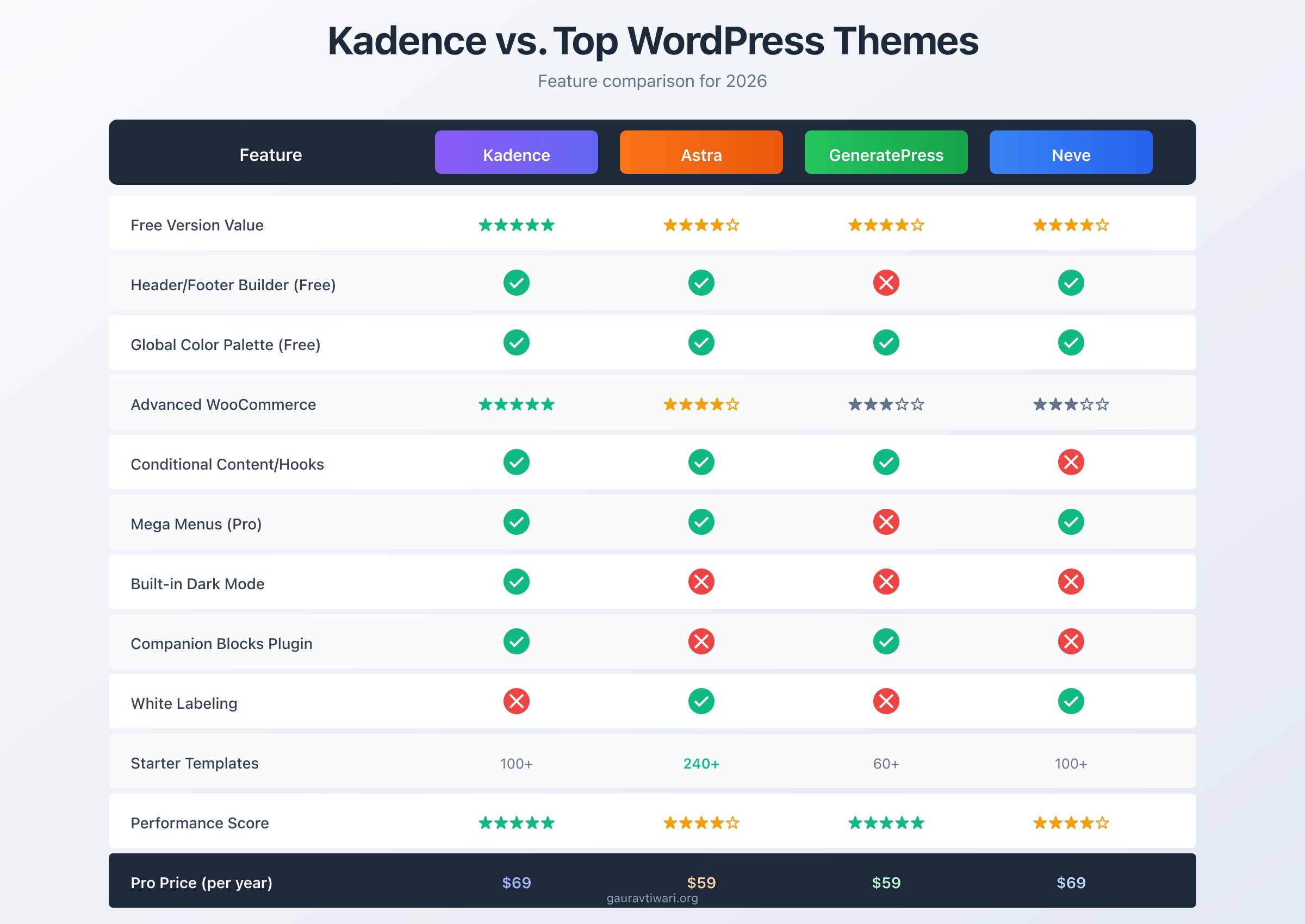 Kadence is my top WordPress theme recommendation for 2026. The free version alone beats most premium themes with its header builder, global colors, and WooCommerce integration. The pro version adds hooked elements, conditional headers, mega menus, and dark mode. Now part of StellarWP, it gets consistent updates and long-term support. Best fit for bloggers, ecommerce stores, and anyone who wants page-builder power without the performance penalty.