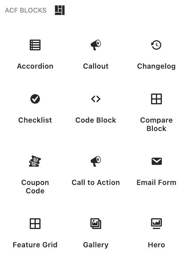 - Pre-built widget libraries? My 28+ ACF blocks cover testimonials, CTAs, product boxes, accordions, tabs, comparison tables, and more.
