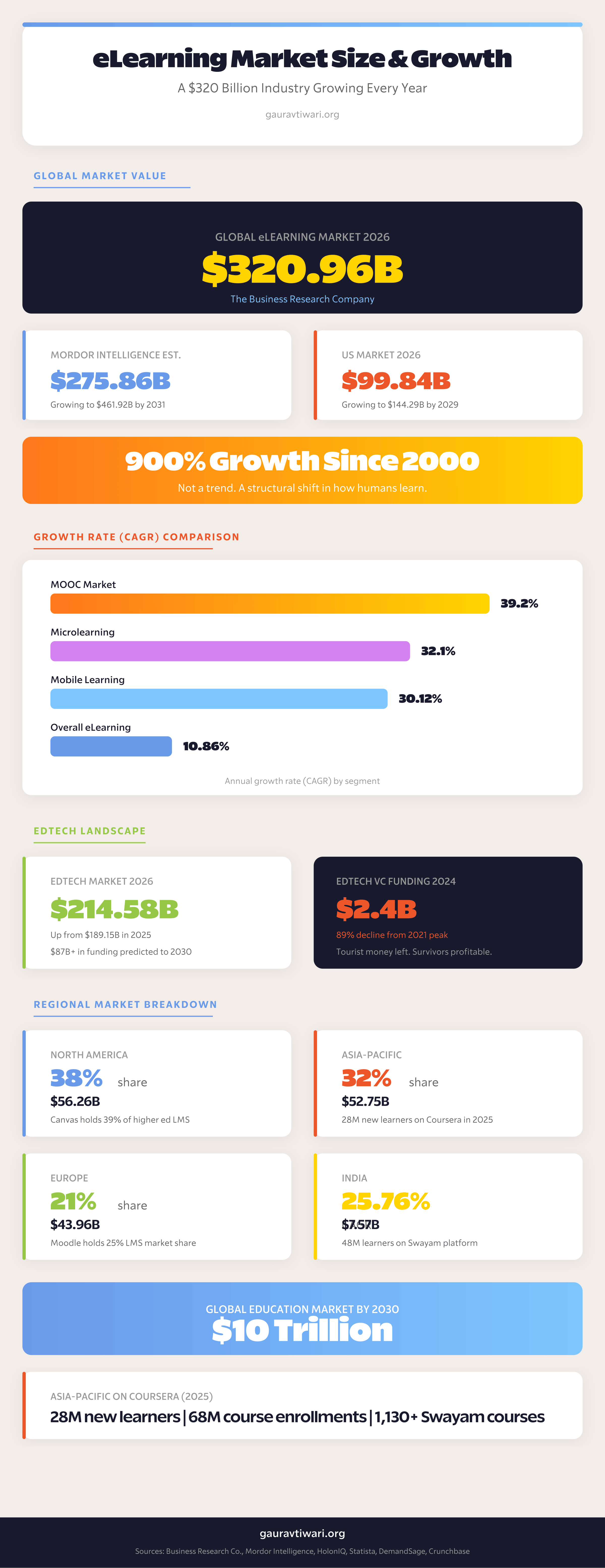 Asia Pacific saw 28 million new learners and 68 million course enrollments in 2025 on Coursera alone (Coursera / DemandSage). India’s eLearning market is growing at 25.76% CAGR and will reach $7.57 billion (Mordor Intelligence). Swayam, India’s national MOOC platform, already has 48 million learners and 1,130+ courses (DemandSage). If you’re only watching the US market, you’re missing half the story.