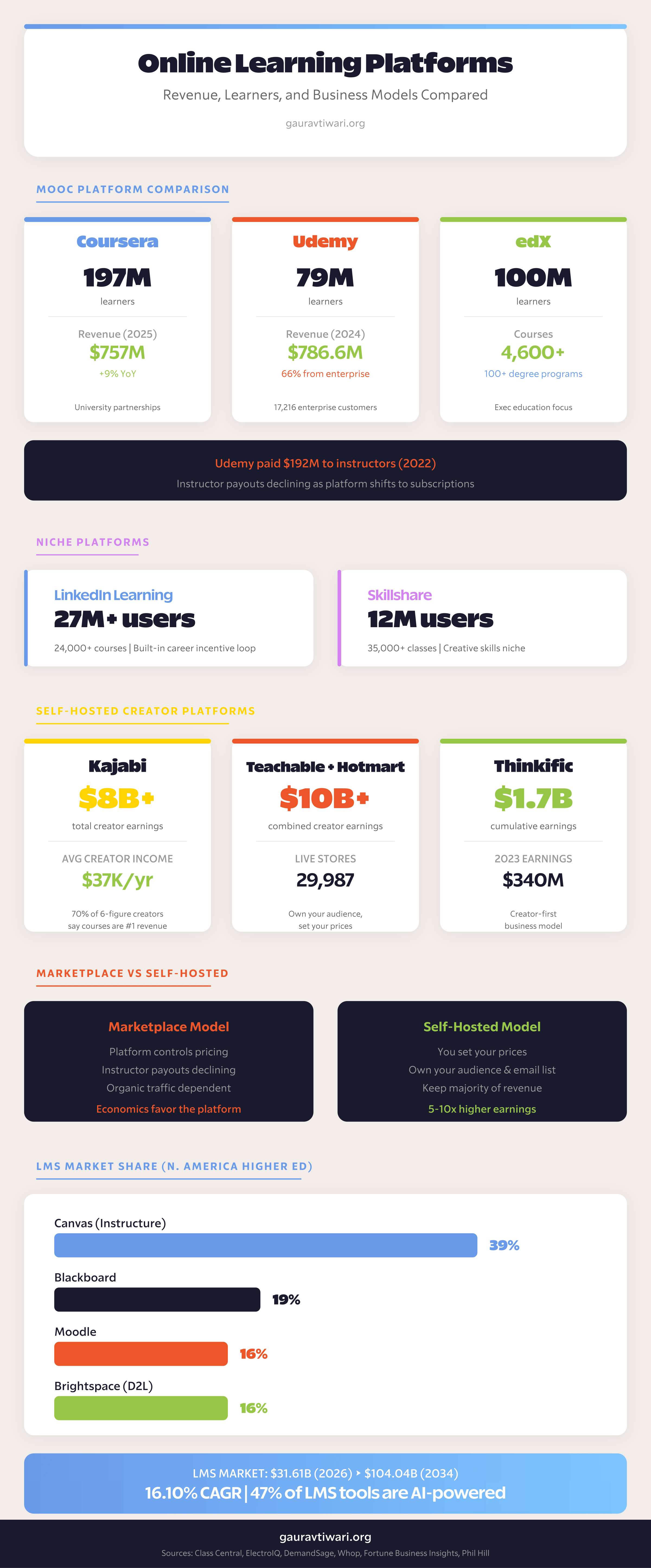 Second, the creator economy is splitting. Marketplace platforms (Udemy, Skillshare) are squeezing creators while growing enterprise revenue. Self-hosted platforms (Kajabi, Teachable, Thinkific) are where creators build real businesses. If you’re starting a course in 2026, own your platform.