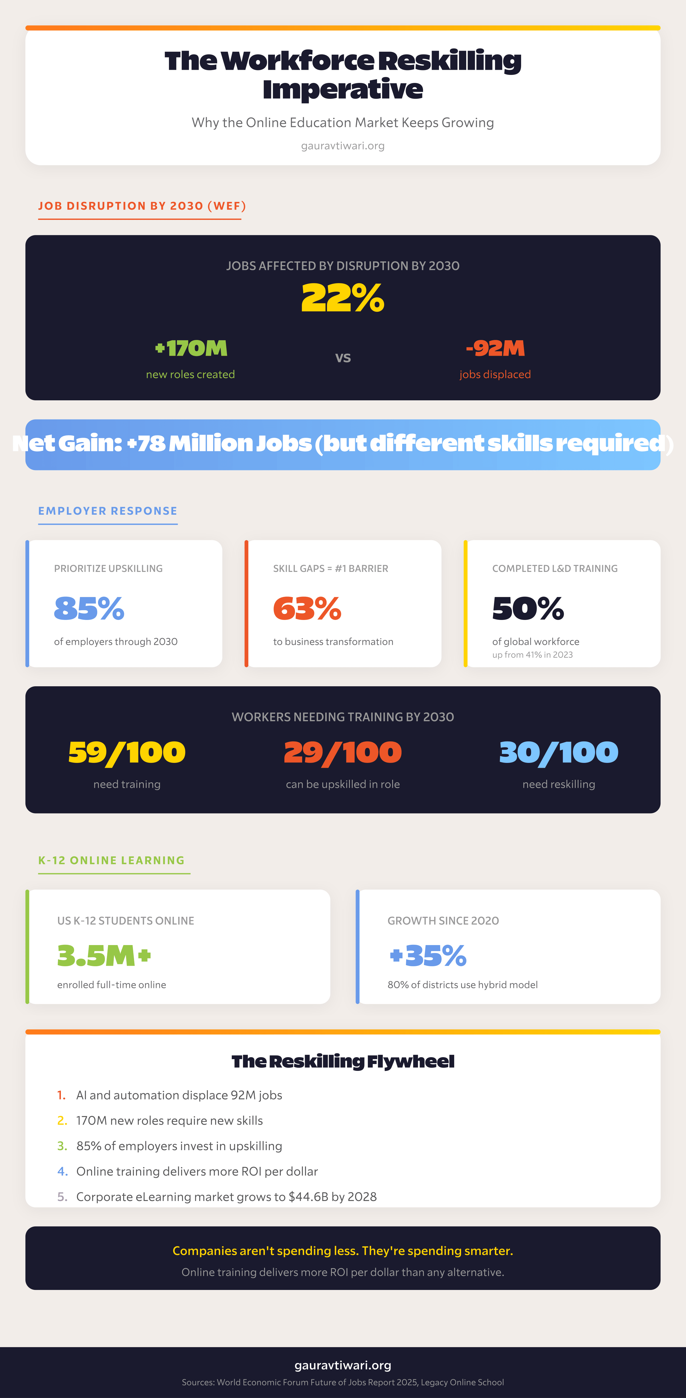 85% of employers plan to prioritize upskilling their workforce (World Economic Forum). 63% identify skill gaps as the biggest barrier to business transformation (World Economic Forum). 59 out of every 100 workers will need training by 2030, but only 29 can be upskilled in current roles (World Economic Forum).