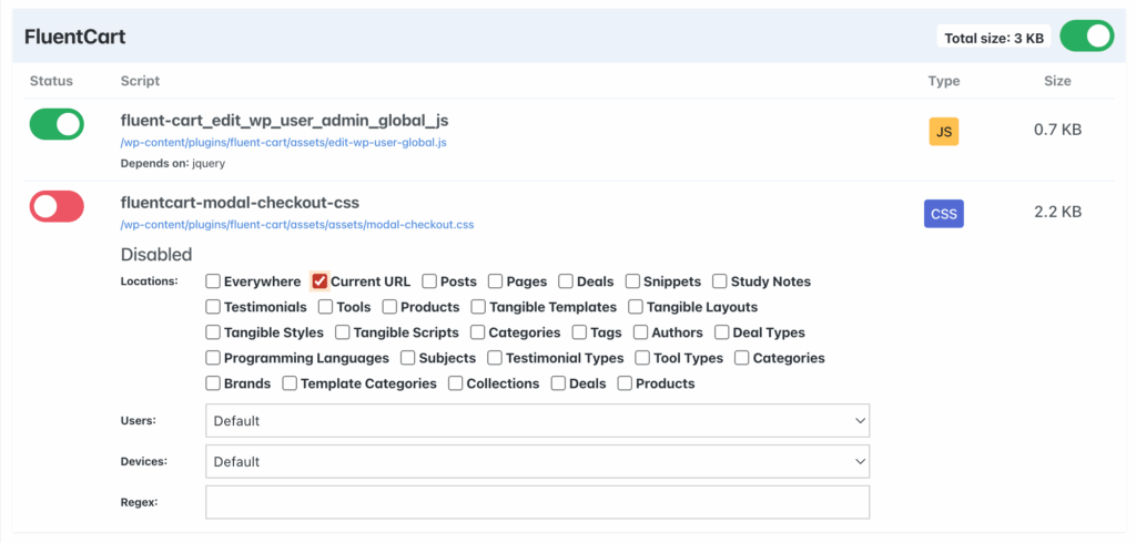 The interface is visual and intuitive. You see the asset name, the plugin it belongs to, and the file path. Then you click to disable. I run it in Advanced Mode with the Script Manager disabled for logged-in users so it doesn’t interfere with admin workflows.