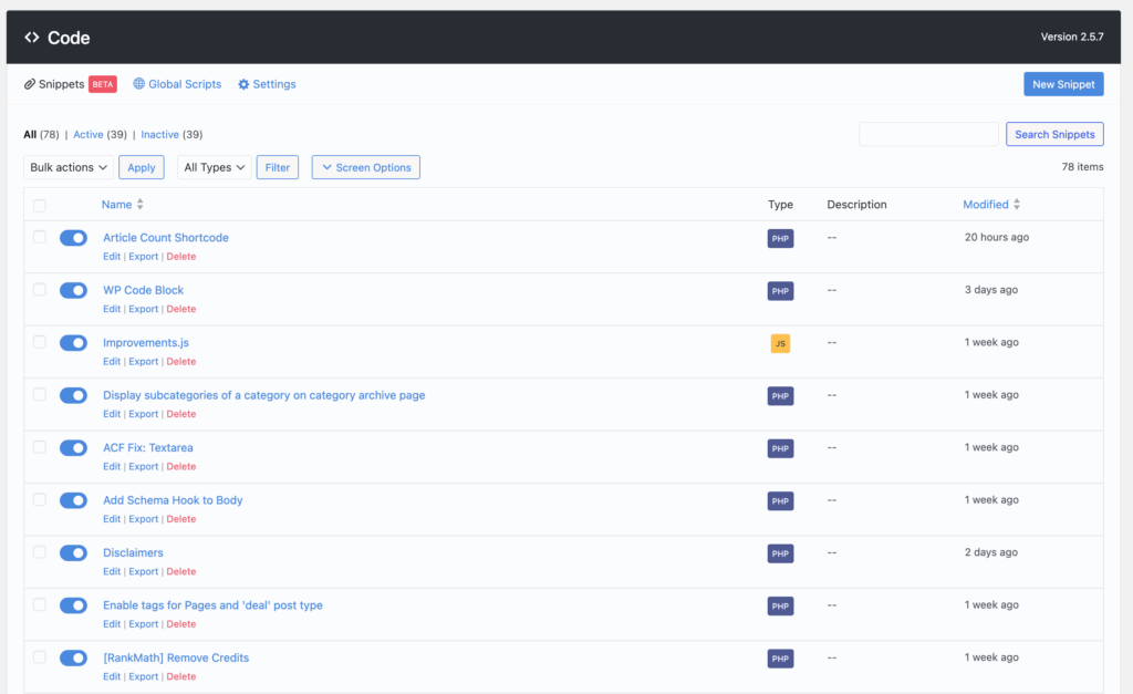I currently run 39 active code snippets through Perfmatters’ built-in code manager — mostly PHP, with a few CSS and JS snippets. They fall into a handful of categories.