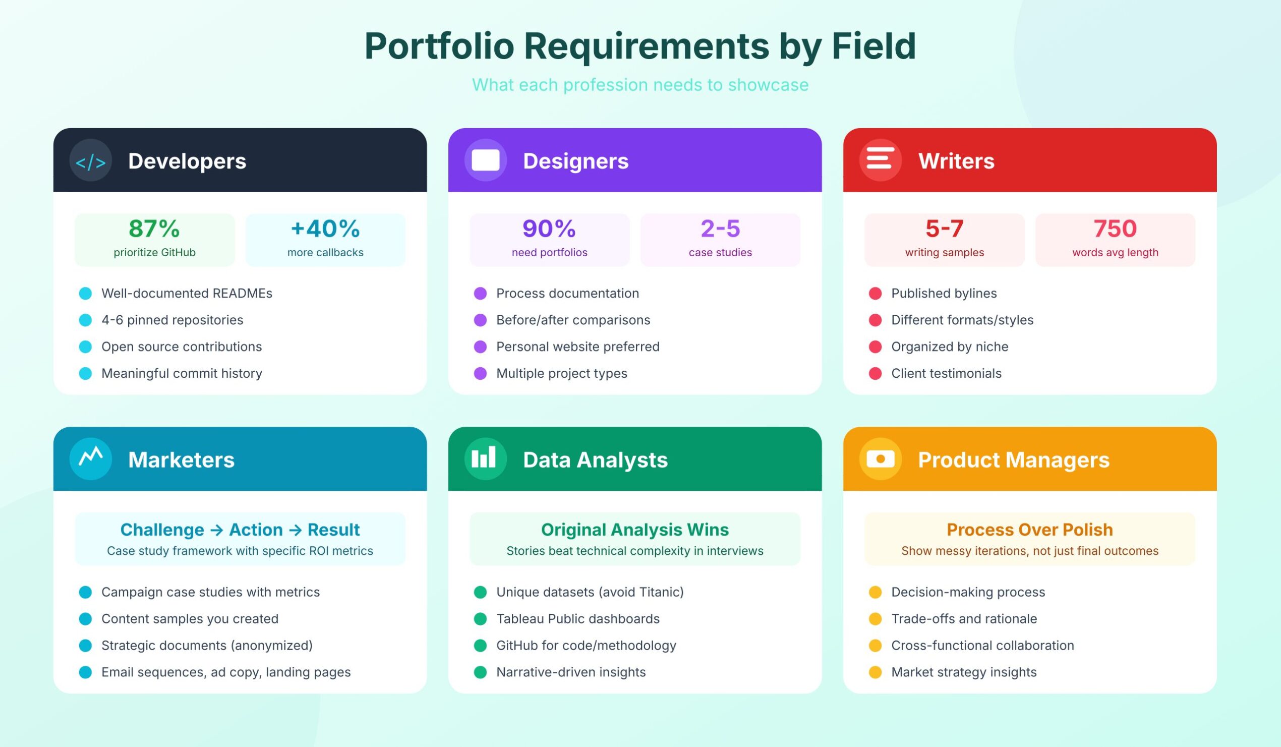 | Industries where essential | Finance, legal, healthcare, HR, operations, consulting | Design (90% expect it), development (87% check GitHub), marketing, content |