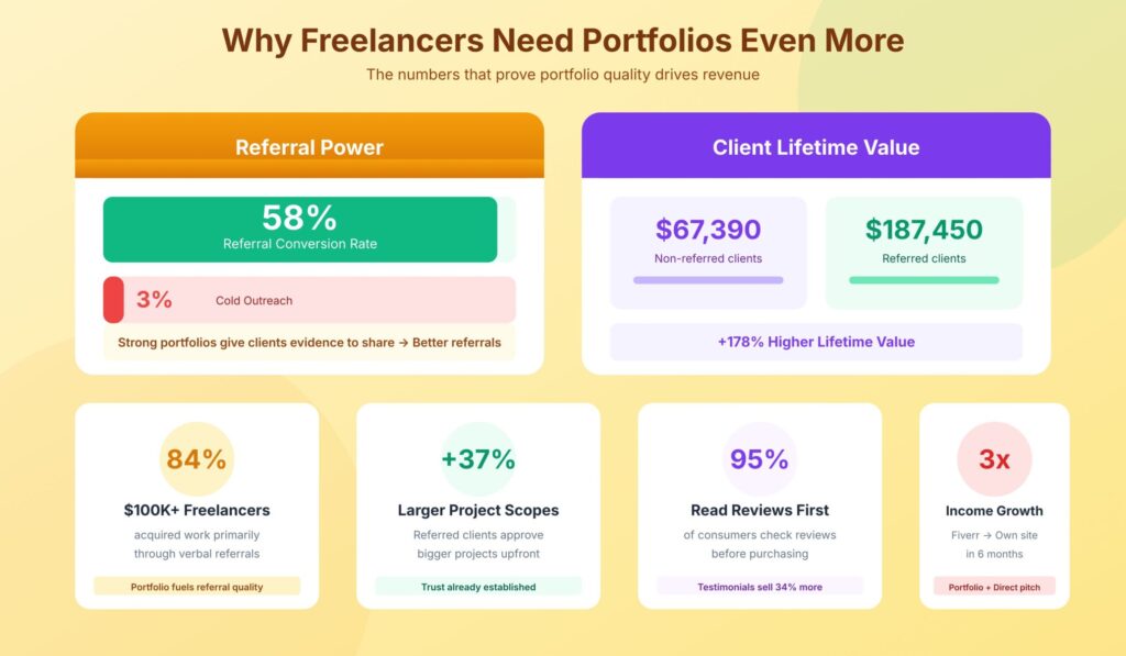 For freelancers, portfolio is even more critical than for job seekers. Referrals dramatically outperform other acquisition channels, converting at 58% versus 3% for cold outreach.