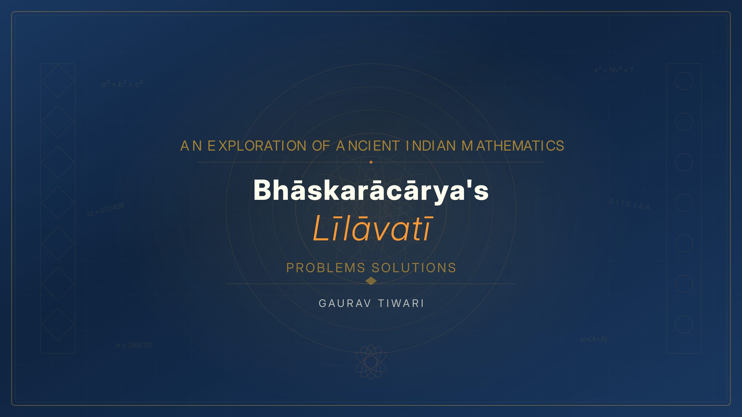 Famous problems are solved step by step. The Beautiful Maiden’s Riddle, the Peacock and the Snake, the Bees and the Lotus, the Broken Bamboo. Each solution shows both Bhaskara’s original approach and modern methods.